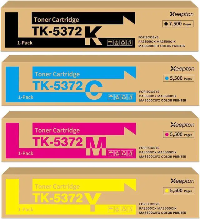 Package Contents: 1 X TK-5372 black TK-5372K, 1 X TK-5372 cyan TK-5372C, 1 X TK-5372 magenta TK-5372M, 1 X TK-5372 yellow TK-5372Y, total 4 Compatible TK-5372 Toner Cartridges