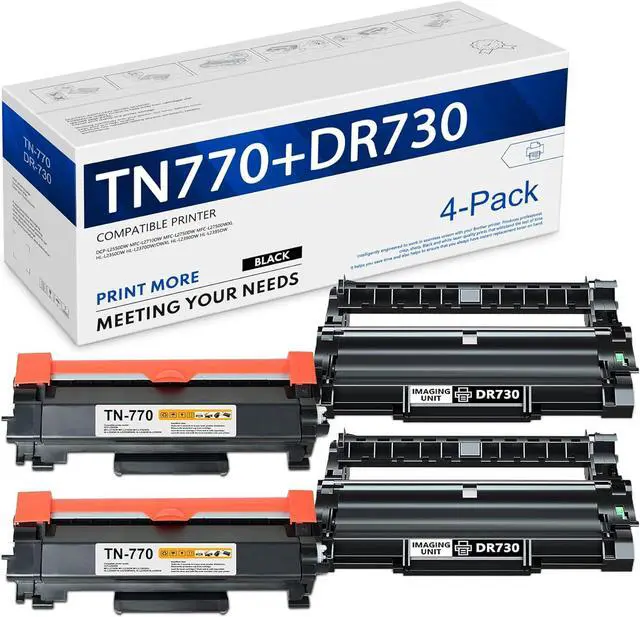 Package Contents: 2-Pack DR730 Drum Unit and 2-Pack TN770 Super High Yield Toner Cartridge.