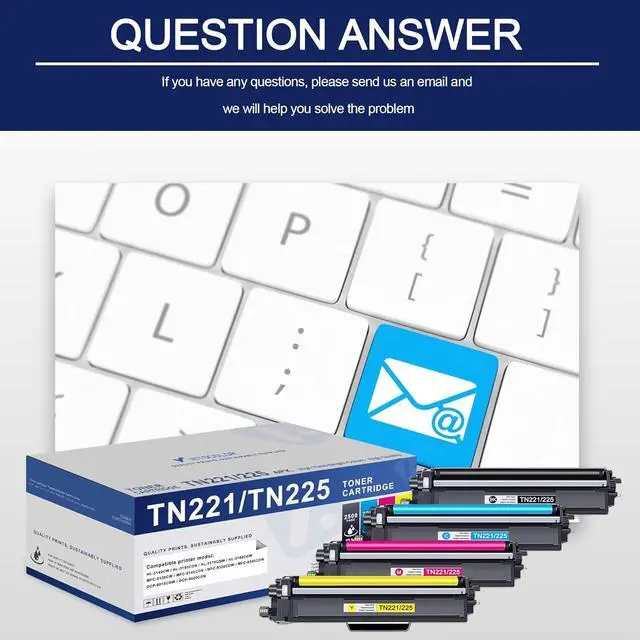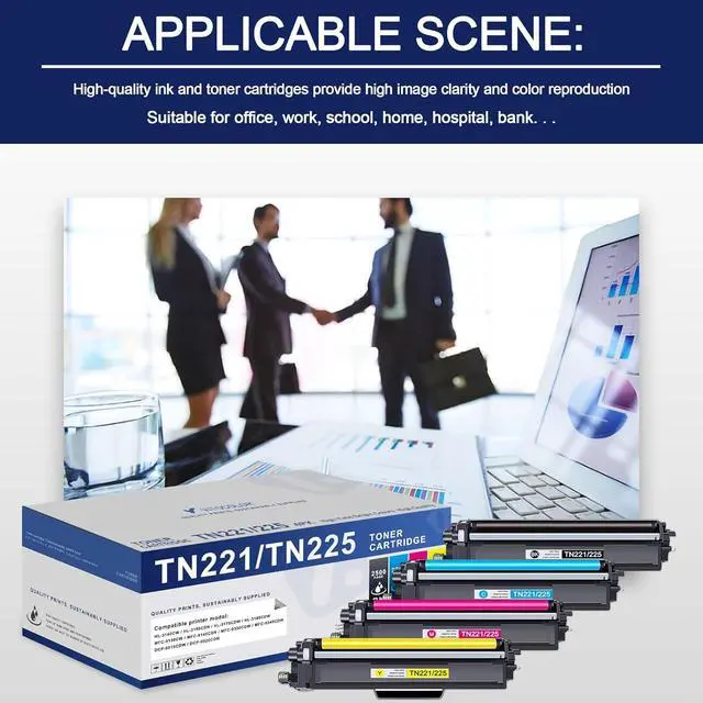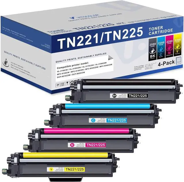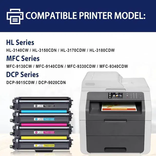 Compatible with: TN221/225 toner cartridges Compatible for Brother HL-3140CW,HL-3150CDN,HL-3170CDW,HL-3180CDW,MFC-9130CW,MFC-9140CDN,MFC-9330CDW,MFC-9340CDW,DCP-9015CDW,DCP-9020CDN Laser Printer