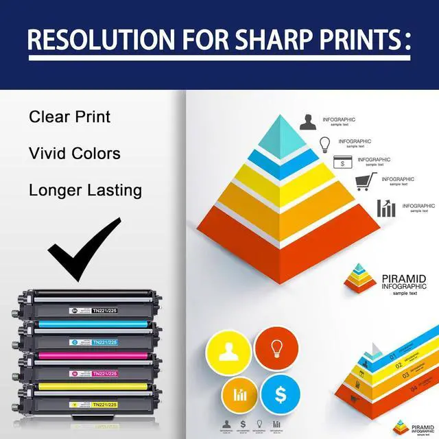 High Page Yield: TN221/225 toner cartridges 4 pack Up to 2,500 Pages for TN221/225 Black Toner Cartridge, up to 2,200 Pages for TN221/225 Color Toner Cartridge(at 5% coverage on Letter/A4 size)