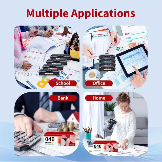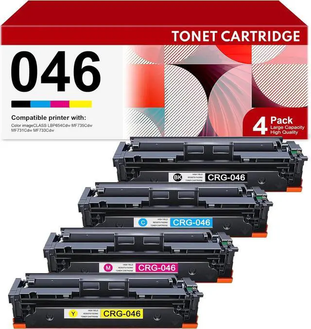 Include: 4 Pack 046 toner cartridge set (1 X 046 Black Toner Cartridge, 1 X 046 Cyan Toner Cartridge, 1 X 046 Magenta Toner Cartridge, 1 X 046 Yellow )