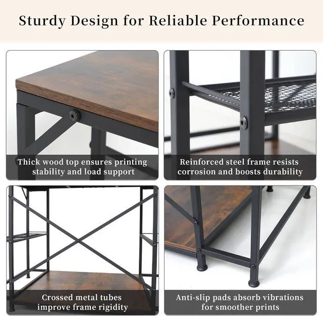 Strong & Reliable BuildCrafted with thick wood boards and a reinforced metal frame, this double-layer 3D printer stand delivers strong support and lasting stability. Water- and wear-resistant surfaces are easy to clean and maintain, while the anti-corrosion frame ensures long-term use. Supports 300 lbs on the top shelf and 150 lbs below, providing superior load-bearing capacity and preventing wobbling or tipping. Ideal for storing your printer, filament spools, and tools.