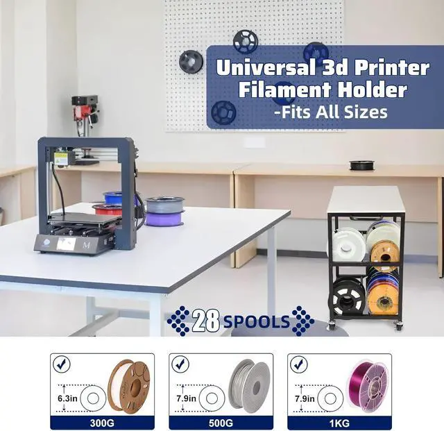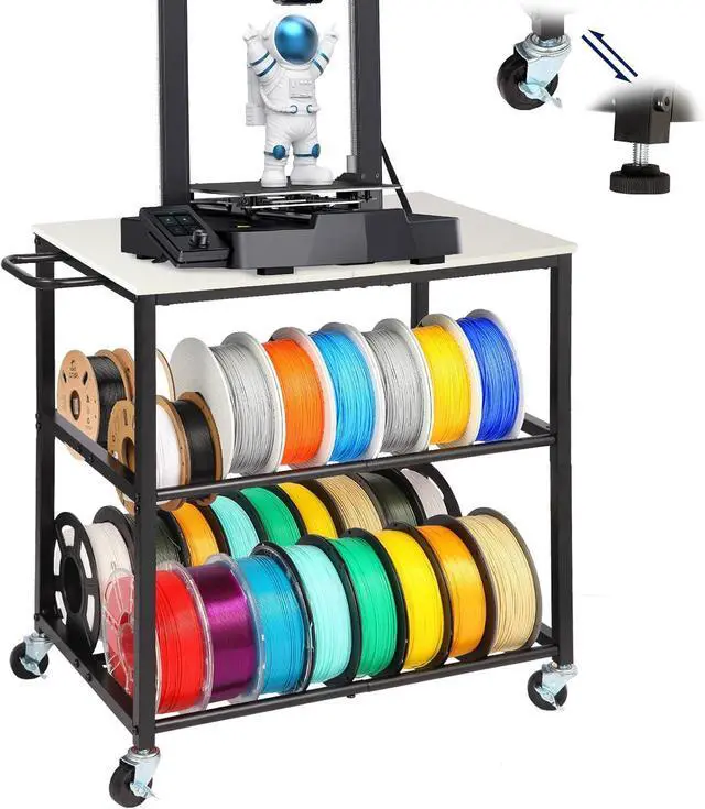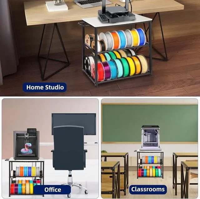 3D Printer Table with StorageThe 23.6" (L) x 15" (W) wooden top surface is perfectly sized for compact 3D printers. The bottom two tiers offer filament storage, holding up to 32 rolls of 1kg filament, and are compatible with filaments of all sizes. This space-saving design keeps your 3D printing setup organized, efficient, and clutter-free.