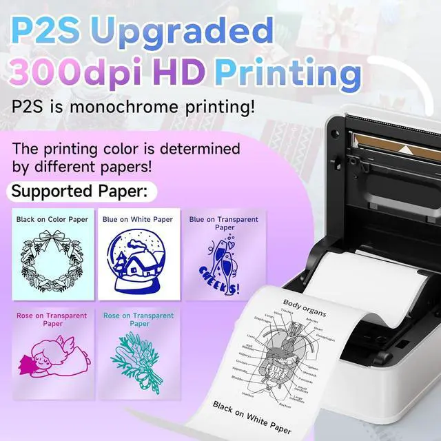 300dpi Hd Printing: P2S sticker printer with new high-definition printing technology, enjoy crisp and clear printed images. The 300dpi high-resolution printing satisfies all your academic and photo printing requirements