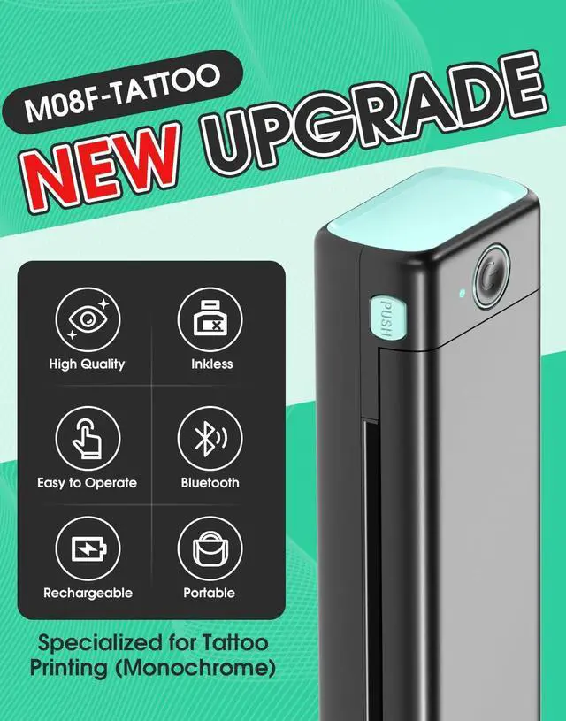 Rechargeable - The M08F cordless Bluetooth tattoo printer with a large capacity 1200mAh battery. With just one full charge, you can print up to 220 pages of light-colored images or text, making it perfect for multiple tattoo printing sessions. As an added bonus, M08F stencil printer for tattooing include 10 sheets of tattoo transfer paper to help you get started.