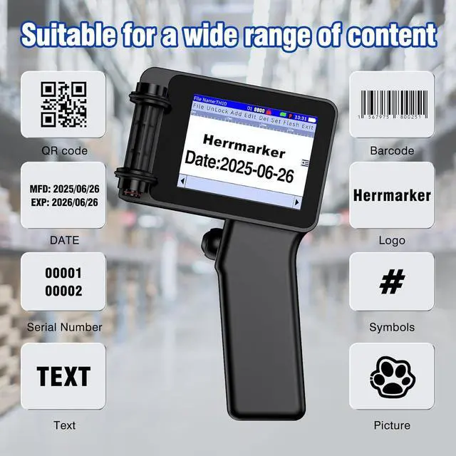 Multi-function Mini Print GunThe Herrmarker small handheld inkjet printer comes with a positioning plate and can print QR codes, barcodes, dates, times, images, text, expiration dates, logos, and batch numbers on various surfaces, including metal, wood, glass, fabric, cardboard, plastic, paper, ceramic, leather, stainless steel, aluminum plates, cartons, and even curved surfaces at 360°.(Tips: Requires stylus operation)