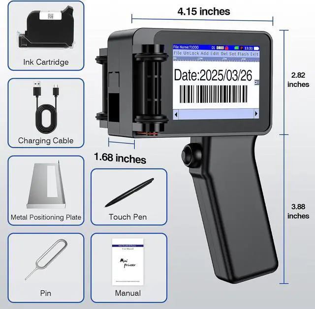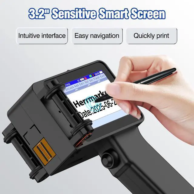 3.2-inch HD Touch Screen PrinterThe Herrmarker T1000 mini handheld batch code printer feature a vibrant 3.2-inch HD touch screen for intuitive control. Ultra-clear resolution ensures that text, barcodes and logos are clearly visible. Herrmarker handheld ink printer supports USB file transfer, allowing you to import custom BMP/JPG images and TTF fonts for personalized printing. The adjustable printing height (0.08-0.5 inches) and multi-line capability (1-5 lines per print)