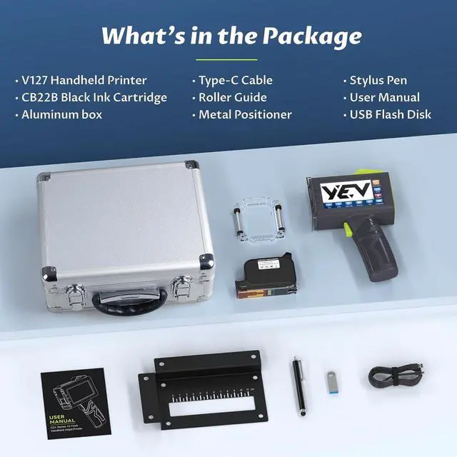 USB File Printing: YEV V127 handheld printer allows you to print directly from USB files, supporting external fonts (TTF format) and various file types including CSV, JPG, PNG, and BMP. It can print variable text, QR codes, DM codes, and barcodes, perfect for batch labeling across industries.