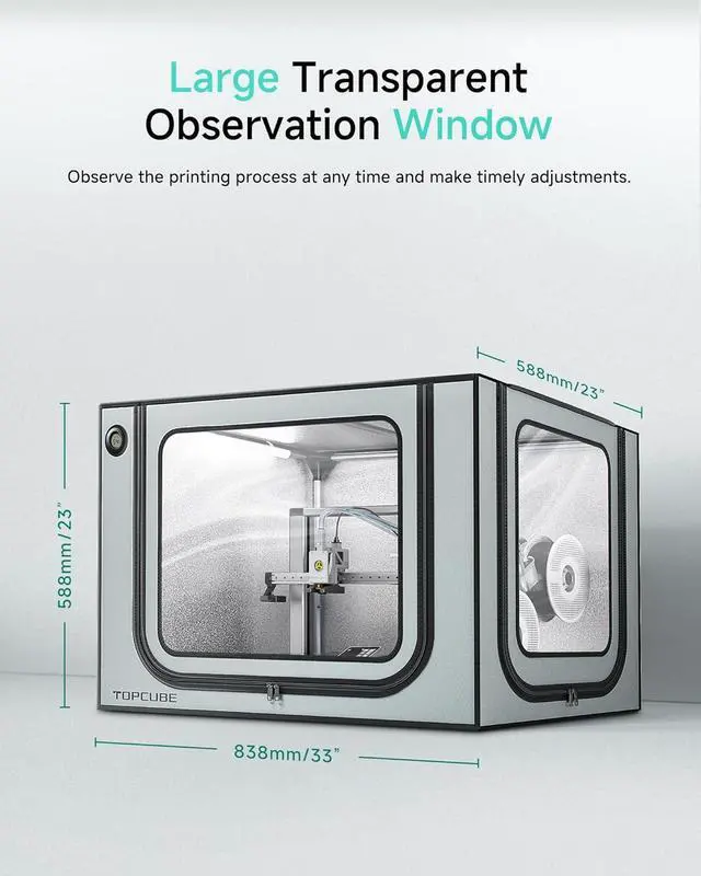 Enhanced Visibility: Benefit from a extre large transparent observation window that allows you to monitor the printing process in real-time. The integrated LED light strip illuminates the printing area, enabling easy monitoring even in low-light conditions to quickly address any potential issues.