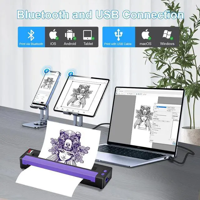High Compatibility: P19 professional tattoo stencil printer is compatible with various devices including smartphones, tablets, laptops, and desktops. It can connect via Bluetooth to print from Android and iOS smartphones or tablets, and connect via a USB cable to print from computers running Windows, MacOS, and ChromeOS.