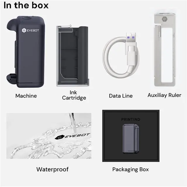 Suitable for Any SurfaceEvebot PrintInd portable inkjet printer uses solvent-based ink cartridges and can print on metal, plastic, glass, wood, cement, fabric, leather and other surfaces. It uses a roller sensor and also supports printing on curved surfaces. The ink is waterproof but can be erased using alcohol.
