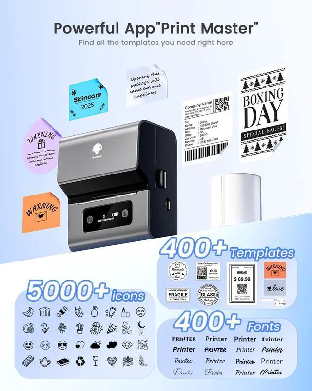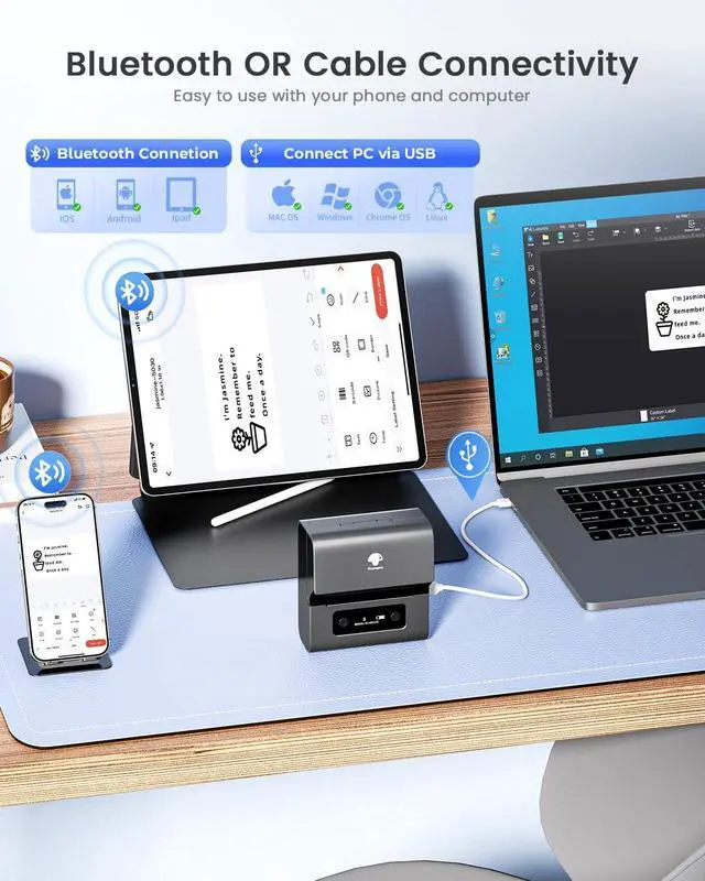 Bluetooth Connectivity& Easy SetupWirelessly connect to your smartphone, tablet, or PC via Bluetooth. User-friendly app makes designing and printing custom labels simple - create professional labels in seconds from anywhere.