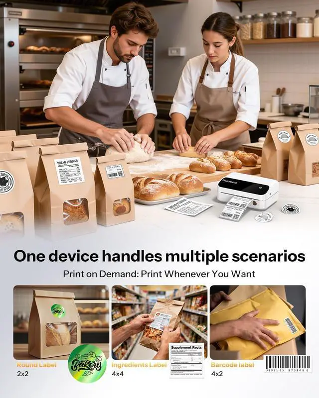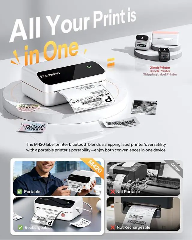 2026 Upgraded Portable 4x6 Thermal Printer- Phomemo M420 4x6 Bluetooth Label Printer is equipped with a high-precision 4-inch wide thermal print head, supporting thermal labels in widths from 1.57" to 4.1". No toner or ink is needed, and it features an LED LCD control button for simple operation. Producing crisp, clear prints, this rechargeable cordless printer frees you from the hassle of a constant power supply (unlike traditional shipping label printers) print your labels anytime, anywhere with ease.