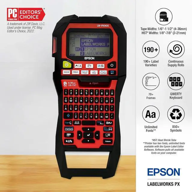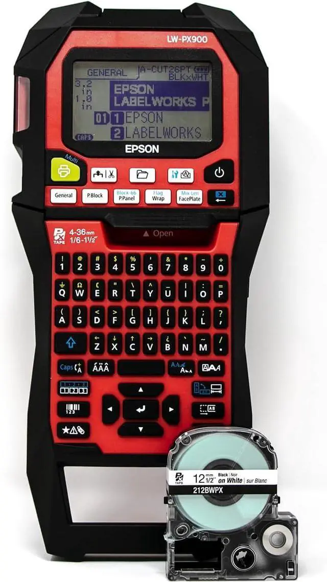 Max Tape Width1.5" (36MM)DPI360CutterAutomatic with half-cut and full-cut function Margins10MMMax Print Speed35mm/sHalf-CutYesAC PowerYesImport Graphics From PC / Import + PrintImport ExcelYes PC ConnectYesBatteries6AA, Lithium-IonMax Heat Shrink Tape Width21mm (7/8") - 221STB***Windows PC SoftwareEpson Label Editor (Windows 8, 8.1, 10, 11) *Not compatible with ARM ProcessorsApps (iOS / Android)Not app compatible Epson LabelWorks LW-PX900 Printer Great Resolution Avoid Tape Waste Lithium-Ion Battery Functional Buttons Your One-Stop Labeling Shop LW-PX900 Industrial Label Maker Specifications