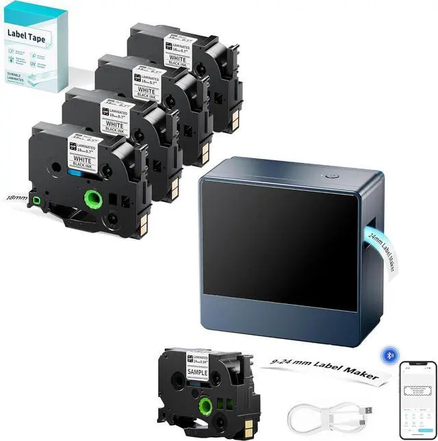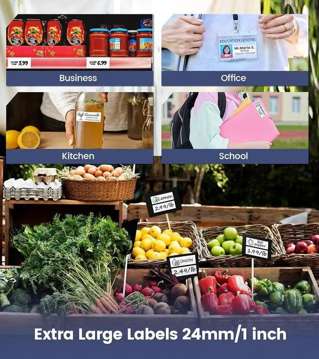 Wide Waterproof Labels Support: The 24mm label maker machine with tape waterproof print labels 9mm to 24mm 1 inch wide, plus 9mm, 12mm, 18mm sizes labels. Good for organization, shipping, packaging, name tage, and small business labeling needs with auto-cuttiung feature, it aslo can be a practical gifts for teachers business man, and organized people