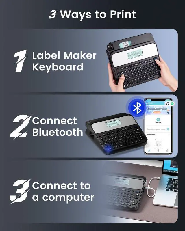 : 1. Classic QWERTY Keyboard : Quickly create labels using the familiar QWERTY layoutno phone required. 2. USB/Bluetooth Computer Connection : Easily connect to your computer via USB cable or Bluetooth for seamless label creation; 3. Bluetooth Smartphone Large Print Labeler: Compatible with both Android and Apple devices, this mode allows you to design and print labels directly from your smartphone