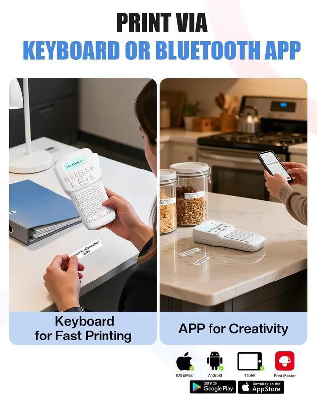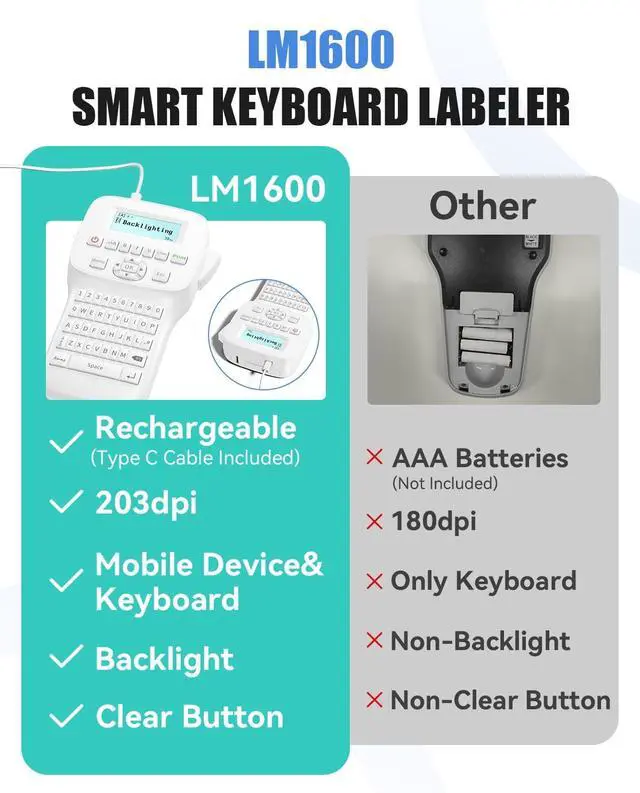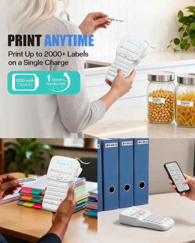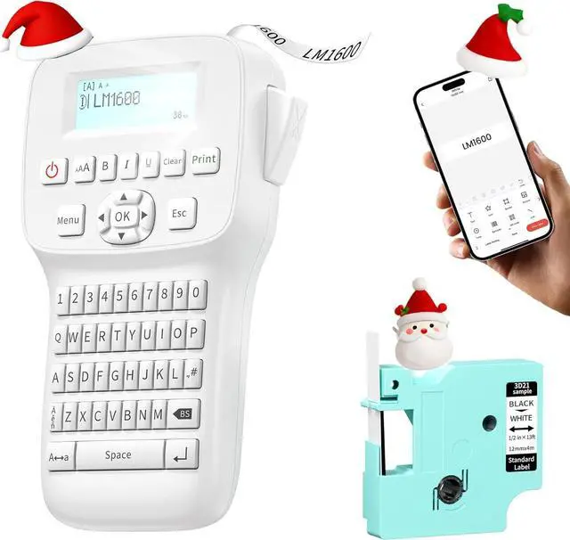 EazeID LM1600 Label Maker Machine with DZ Tape (12mm 0.47 Inch Black on White) Backlit Screen take care of your eyes Two in One Label Maker Bluetooth or Keyboard USE LM1600 Bluetooth Rechargeable Label Maker with QWERTY Keyboard & Backlit Screen Supports Multiple Colors and Style Labels