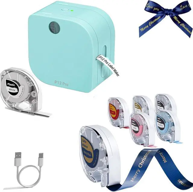 Label Maker Machine with 6 Tapes: 1x P12 PRO Label Maker Machine, 2x Black on White P12 Label Tape(12mm X 4m), 4x Ribbon for gift wrapping(Nave Blue/Pink/White/Blue)(12mmX 2m), 1X USB-Charging Cable