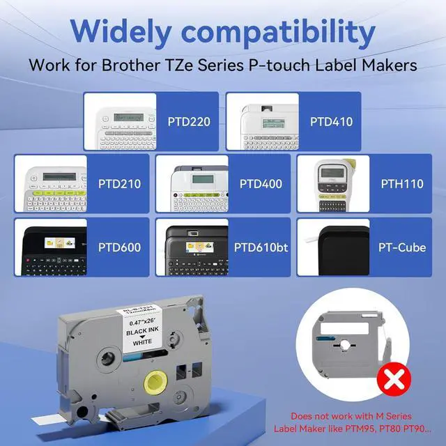 [Compatible Printers]Compatible with Brother P-Touch Models: PTD210, PTD220, PT-H100, PTH110, PT-H111, PT-D200, P300BT Cube, PT-D200G, PT-H101GB/H101C/H100R/H101LB/H75/H100/H101/H105/H107/H107B/H108/H110/H200, PT-900/1000/1005/1080/1010/1250/D200/D210/D400/E100/E110/GL200, PT-P700/P750W, PT-1090/1230/2430PC/PTE100VP, PT105WB, PT-H300/H300LI/H500LI, 1190, PT-11Q, PT-1230PC, 1880C/1890C/1890W, PT-6100, D200G, etc