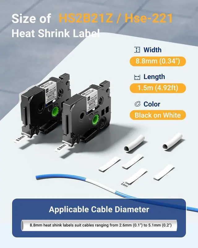 Cable Diameter Recommendation: Vixic HSe-221 Heat Shrink Tube Labels are ideal for the permanent identification of cables, fibers, and wires. They are designed to accommodate a wide range of diameters from 2.6mm (0.1") to 5.1mm (0.2"), ensuring a secure fit