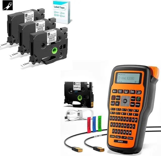 Package Included: 1 x E1000 handheld label maker orange, 1 x starter laminated white tape 0.47"*13.1', 3 x HS2B21Z heat shrink label, width: 8.8mm (0.34"), length: 1.5m (4.92ft), 1 x USB Type-C cable, 1 x replacement cutter holder, 1 x user manual