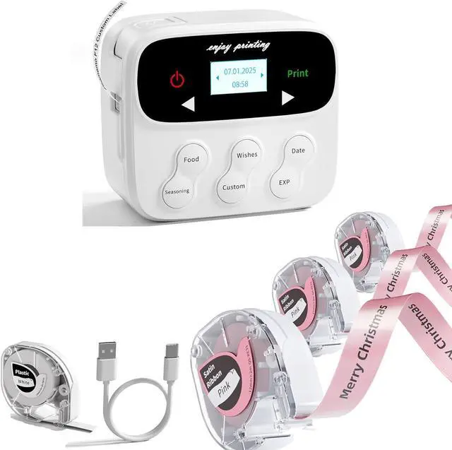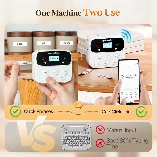 Ribbon Printer Machine Dual Operation Mode, 1: Shortcut key printing, screen word selection, one-click printing time and date, no need to manually edit input, from power on to printing, it only takes 5 seconds, you can label home, kitchen, food. 2: Bluetooth connection APP, get richer label templates, create personalized labels