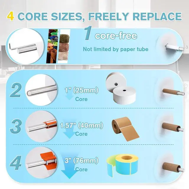 4 CORE SIZES, FREELY REPLACE: Equipped with 3 core holders: 1 (25mm)/ 1.57 (40mm)/ 3 (76mm). In addition, you can use the L-rod for corefree rewinding without the constraints of tube cores, which is extremely suitable for rewinding fabrics, elastic bands and so on.