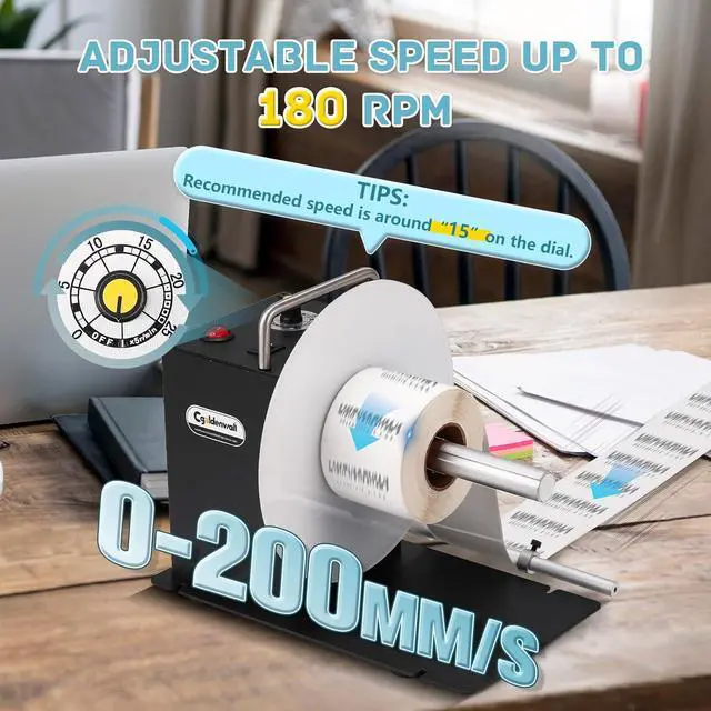 0-200mm/s SPEED ADJUSTABLE: The label rewinder has a high quality brushless motor, making the speed up to 180RPM, high power and low noise. Recommended speed is around "15" on the dial. (TIP: The specific speed depends on your printer's condition. Low speed may trigger self-protection, stopping the motor. Please don't worry, just restart power switch to restore normalcy.)