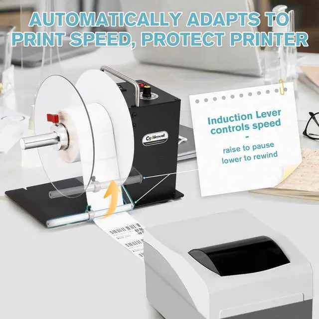 AUTOMATICALLY ADAPTS TO PRINT SPEED: Stainless steel induction lever with gravity self-sensing features, automatically synchronized with the printer speed, to control the rewind speed and protect the print head. (When printer is going too fast or not feeding labels, the inductor lever rises, stops rewinding; when it lowers, continues rewinding.) No need to stay beside the machine to monitor the progress.