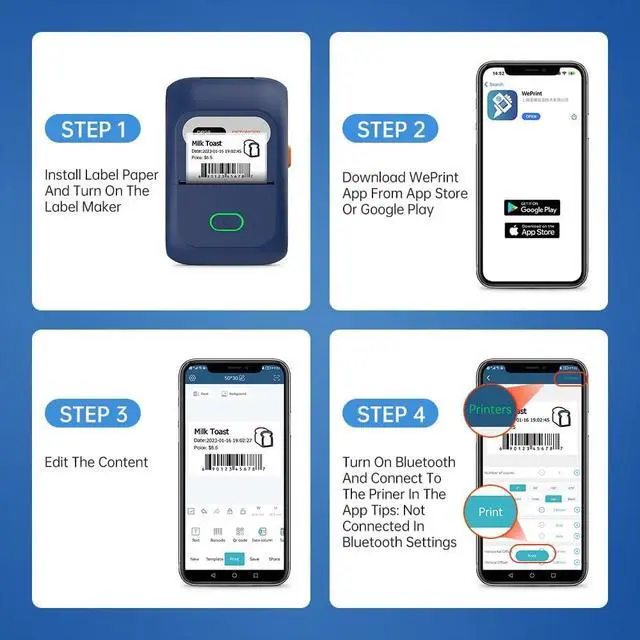 Inkless and Bluetooth Label Maker: Using direct thermal technology with a high-speed chip, it provides 203 DPI print quality. Enjoy high speed and convenient printing without relying on ink or toner. This printing solution is economical, making it ideal for home and small business use.No buttons needed, all functions can be controlled via Bluetooth connection to our "WePrint" APP