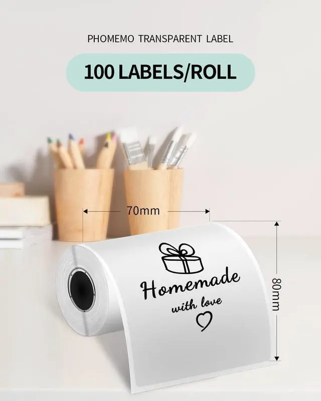 Product Description: 70x80mm Transparent Label thermal printer paper, 100 labels/roll.