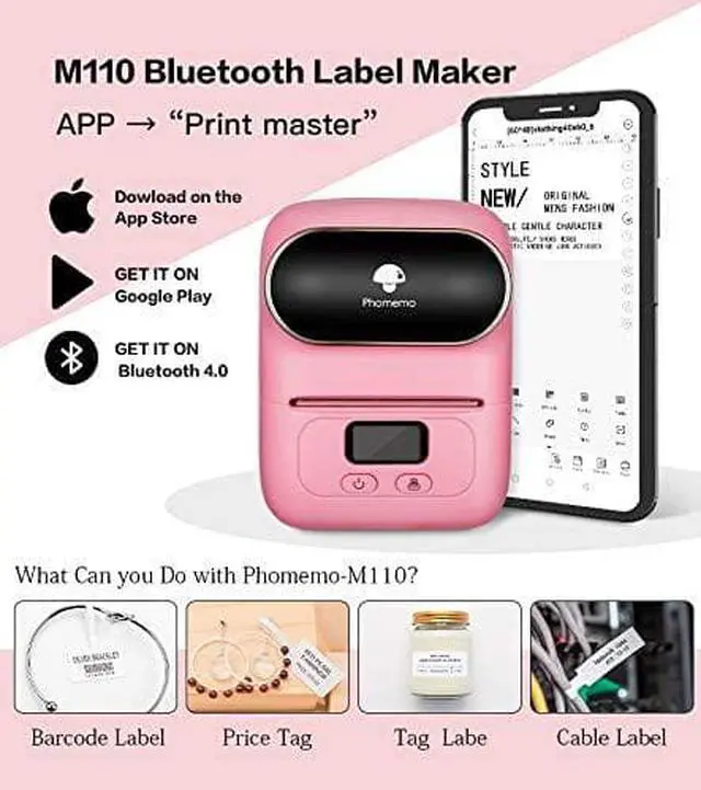 Phomemo M110 Thermal Label Printer with 1 Roll 1.97"x1.18"(50x30mm) Squere Labels, Barcode Label Maker for Snamll Business, Logo, Address, Clothing, Portabel Sticker Printer with 300+ templates, Pink