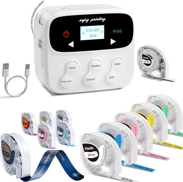 Small & Portable Label Maker: Label maker machine with tape has a magnetic back, so you can keep on your refrigerator or toolbox which saves space. Bluetooth label machine has built-in 6 shortcut buttons, shortcut key word buttons on the label maker directs you to specific label options quicker (i.e. food, seasoning, wishes, custom, date, exp). Backlit LCD screen word selection one-key print date and time
