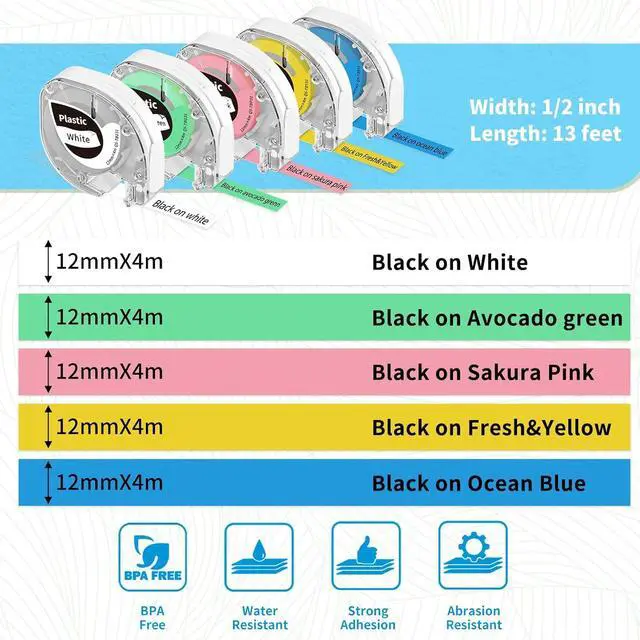 Label Maker with 11 Tape: 1X F12 Label Maker, 5 X Satin Ribbon Label Tape12mmX2m) (Nave Blue/Pink/White/Baby Blue),, 4 X colored label tape(12mmX4m)Q5-TB231(Black on White), Q5-TB531(Black on Blue), Q5-TBP31(Black on Pink), Q5-TBY31(Black on Yellow). Q5-TBG31(Black on Green),2 X black on white label tape,1 X Type-C cable