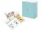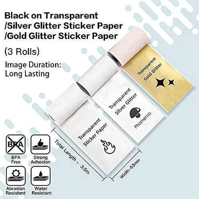 You can get- 1 Cyan M02 mini pocket printer; 1 black on white sticker paper on the machine. 1 Transparent/Silver/Gold Glitter Sticker Paper.