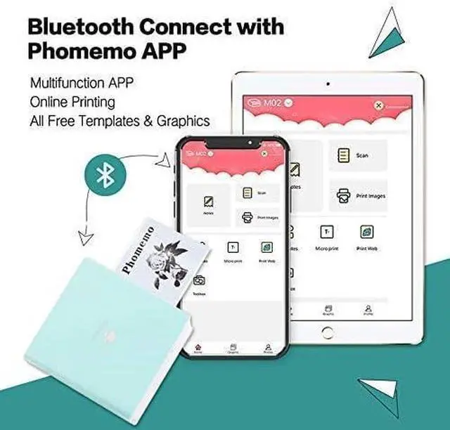 Bluetooth Thermal Printer- Bluetooth 4.0 connection. System for Android 4.0 and IOS8.0 or above. Phomemo M02 pocket printer without ink, only print black and white. Special paper can be printed in blue. And can print transparent paper.