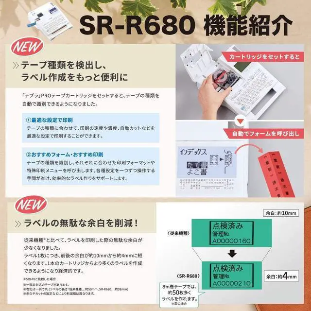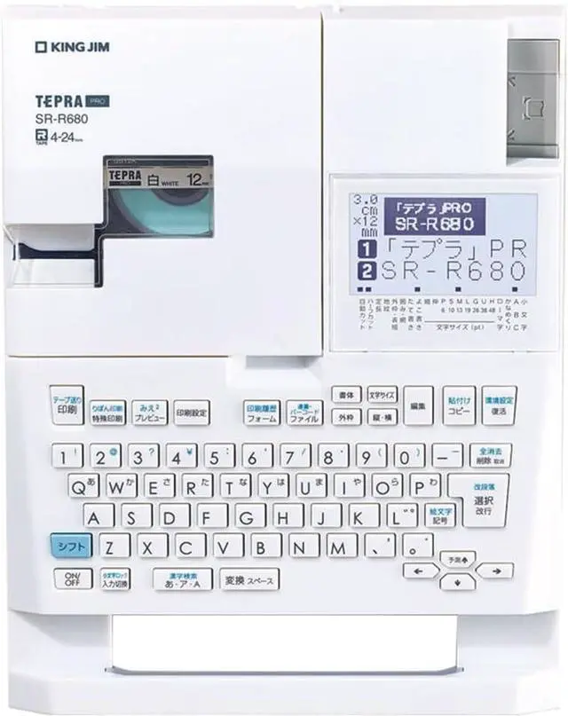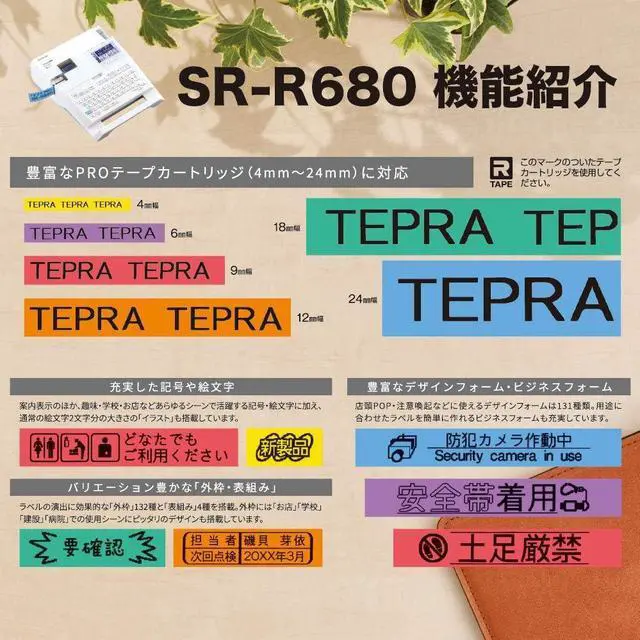 The SR-R680 is a new tepra with the latest JIS symbols as well as features that are ideal for office use and can print less unnecessary space than conventional models, and is easy to understand for foreign visitors. [Product Features] Printed without waste and economical. Compared to conventional models, there is less wasteful margin. If you do not attempt to cut halfway, the margins on the label are shorter from the traditional approximately 10mm to approximately 4mm. For half-cuts, the "half-cut" in the front of the label will be shorter from approximately 11 mm to approximately 5 mm. Automatically calls the form and settings that match the tape (1) The recommended form will be displayed on each business form screen when you set the index, cable display, and equipment management label. (2) Displays "Recommended Printing" and set the transfer tape, ribbon and press [Print] to display each special printed screen. (3) Print with best settings without auto-cut or half-cut tape will be printed without auto-cutting. Non-fast printing tape will automatically print at low speed. Tape recommended for printing concentration "+3" will automatically be printed with the printing density "+3". Comes with a variety of emojis that is perfect for showing guides; Equipped with the latest JIS symbols that are revised to make it easier to understand even for foreign visitors. Other Features: It also has a traditional and convenient feature. (1) Name Tag Printing, Pitto Code Printing Function (2) Auto Cutter with Half Cut Function (3) Fast Printing & Silent Design Model Backlit Display (4) Tape End Detection & Resume Print Function (5) Built-in Font (6) Equipped with ATOK with predictable function (7) Compatible with Computer Editing Labels Software (8) Compatible with Tepra Foreign Language Labels Workshop Product Specs Compatible Tape Width: 4, 0.27, 0.51, 0.71, 0.99 inches (6, 9, 12, 18, 24 mm); Power Supply: AC adapter (included), 6 AA rechargeable nickel batteries (sold separately); Package Includes: Dedicated adapter, trial PRO tape cartridge x 1.
