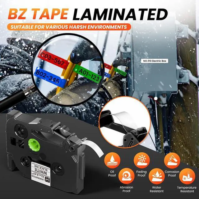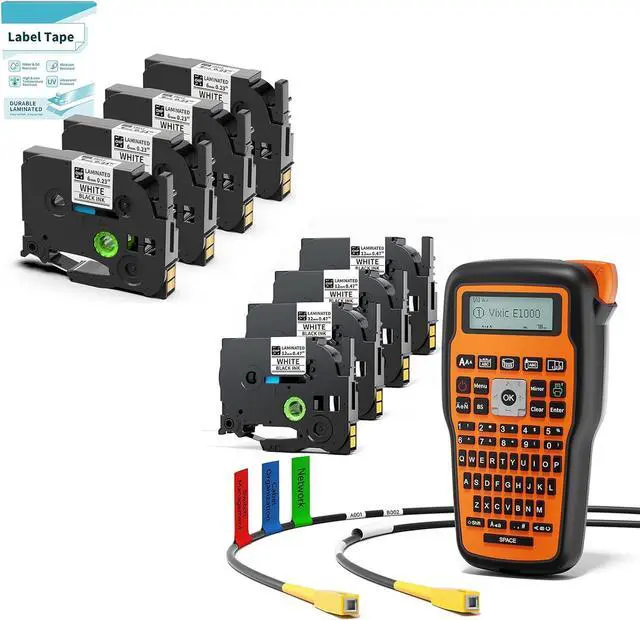 Vixic E1000 Industrial Label Machine includes 8 Pack Premium Laminated Tapes: engineered to produce durable, waterproof labels that resist moisture, abrasion, UV, oil, and harsh conditions. It delivers crystal-clear, professional prints for long-lasting identification