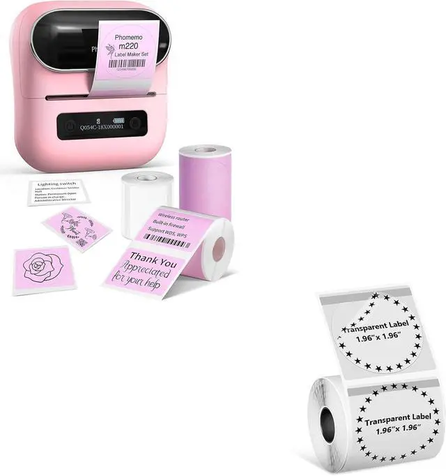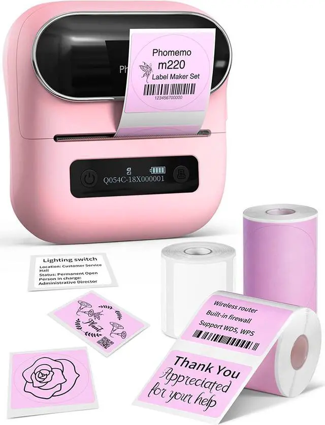 Thermal Label Maker Printer: Phomemo m220 label maker use direct thermal thechnology, print without ink,toner. Keeping your labels clean, clear.This portable label maker come with 3 rolls labels. (1 Roll 40x30mm black in white label, 1 Roll 40x 30mm rectangle pink label, 1 Roll 50x50mm round pink label