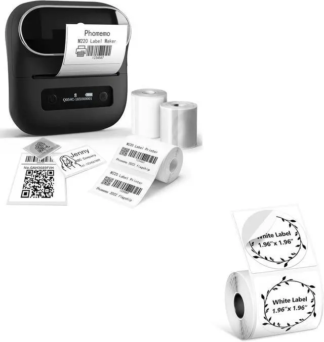 Portable Thermal Label Maker - Smaller size, lighter weight, the label maker machine size is 11 x 10 x 5cm, weight:400g, is half of the tradtional label makers. M220 label maker using thermal technology, meaning this barcode printer never use ink, toner, ribbons again and only need thermal labels to print.The bluetooth label maker come with 3 rolls label tape ( 1 roll 40 x 30 mm labels, 1 roll 40 x 40 transparent round labels, 1 roll 50 x 30mm labels)(Attention: The label maker only support prin