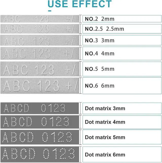 [Size of the wheel]: No 2 wheel: Fonts height 2mm Fonts width 1 mm; No.2.5 wheel: Fonts height 2.5mm Fonts width 1.25 mm; No.3 wheel: Fonts height 3mm Fonts width 1.5 mm; No.4 wheel: Fonts height 4mm Fonts width 2 mm; No.5 wheel: Fonts height 5mm Fonts width 2.5 mm; No.6 wheel: Fonts height 6mm Fonts width 2.8 mm