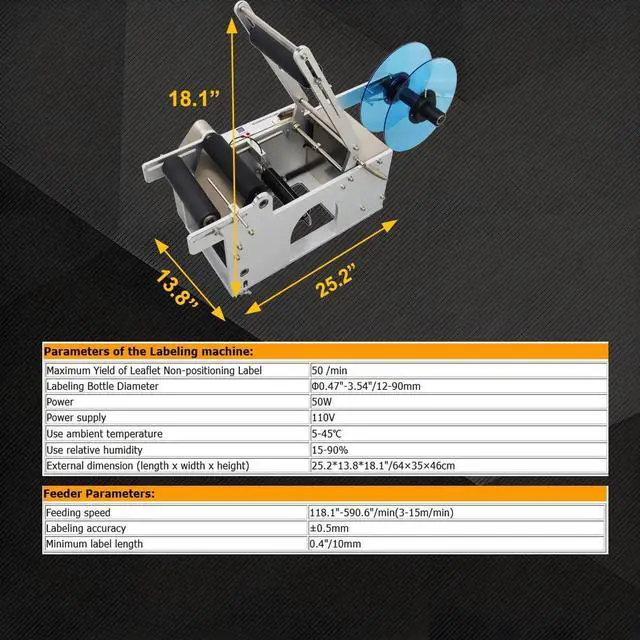 Parameter of the Labeling Machine: Maximum Yield of Leaflet Non-positioning Label: 50 /min; Labeling Bottle Diameter: 0.47"-3.54"/12-90mm; Power: 50W; Power supply: 110V; Use Ambient Temperature: 5-45; Use relative humidity: 15-90%; External Dimension (length x width x height): 25.2*13.8*18.1"/64×35×46cm