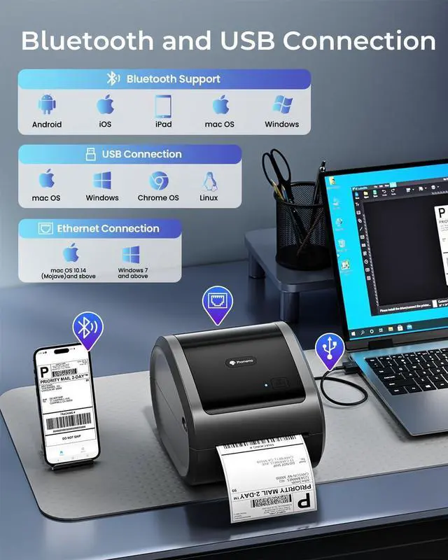 Wireless Ethernet Bluetooth Fast Connection - D530Pro 2025 new upgraded Bluetooth thermal label printer, equipped with high-speed Bluetooth connection, easy to operate within 10 meters can be through the computer and cell phone to print your labels, in addition to the Phomemo shipping label printer also supports the Ethernet/USB cable to connect with the computer.Perfect compatible with Android/iOS phones and Windows/macOS/Linux/ChromeOS computers.