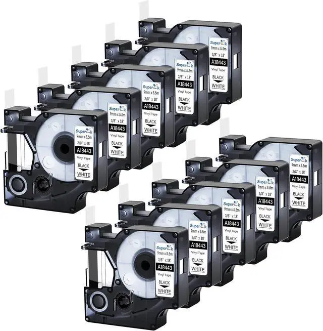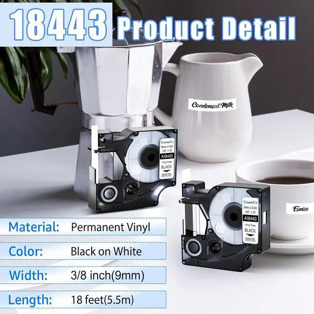 Color: Black Text on White Tape, Length:5.5m(18 feet), Width: 9mm(3/8 inch)