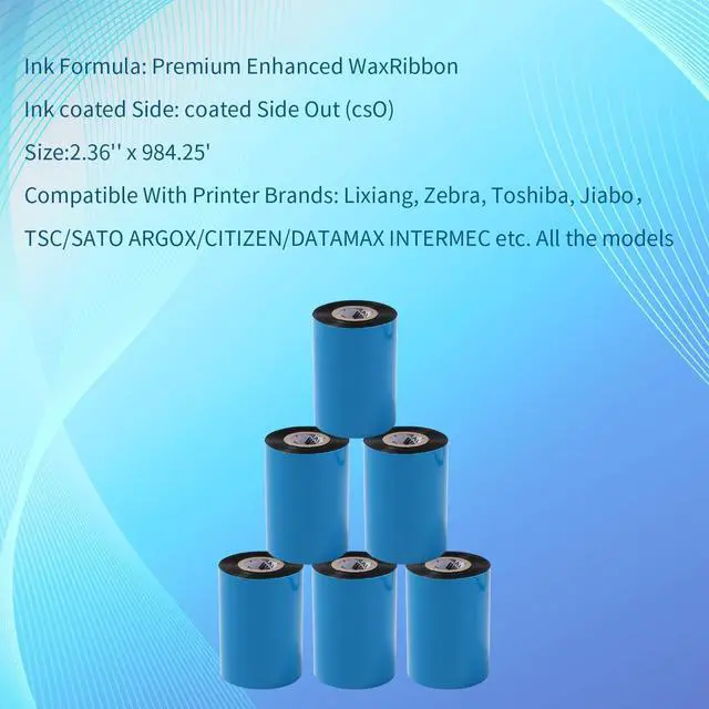 • Compatible PrintersThe 2.36'' x 984.25' (1 Core) ribbon rolls are compatible with INDUSTRIAL models of thermal label printers from major brands like LISO, Zebra, Toshiba, Jabil, TSC/SATO/ARGOX/CITIZEN/DATAMAX INTERMEC