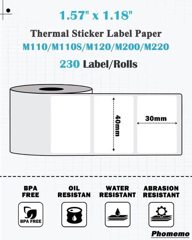 Compatible with: Labels for Phomemo M110 / M220 / M100 / M250 / M102 / M221 / M200 / M120 / M108 / M150 / M160 / M260 / M421 Label Printer. Direct thermal printing technology for clear and smooth printing without ink or toner.