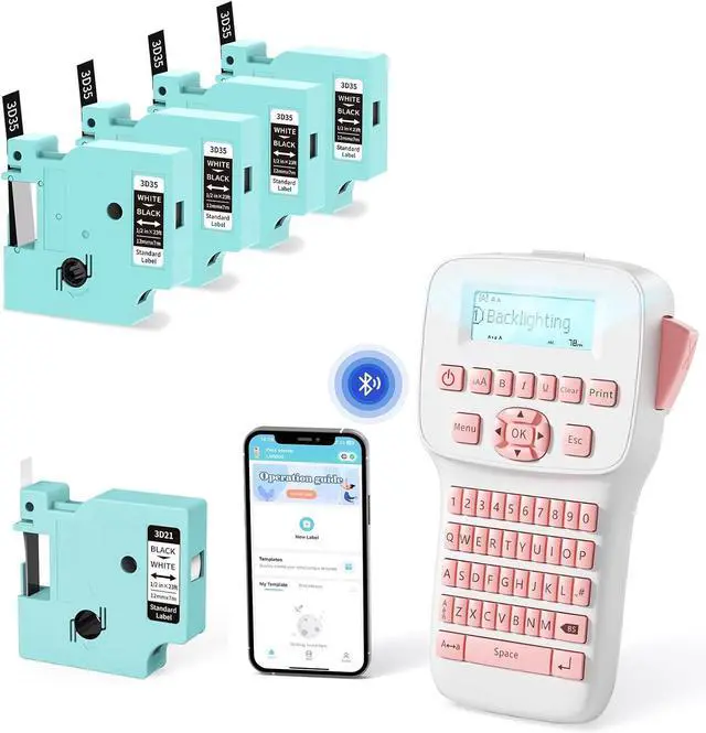 KEYBOARD BLUETOOTH LABEL MAKER - Bluetooth label maker machine with multiple pre-templates/ fonts/ icons/ borders/ languages for Smartphone QWERTY keyboard label maker with built-in cutter for the elderly and children or outdoor workers in network-less environment LM1600 labeler with backlighting LCD Screen for dark environments Auto shrink ribbon function makes label less prone to jamming.