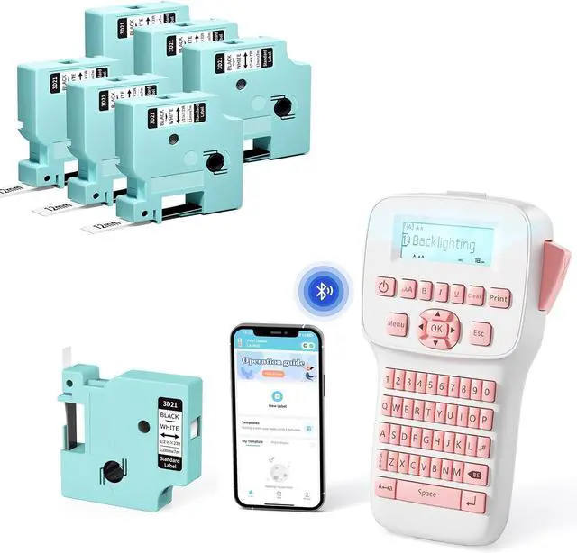 KEYBOARD BLUETOOTH LABEL MAKER - Bluetooth label maker machine with multiple pre-templates/ fonts/ icons/ borders/ languages for Smartphone QWERTY keyboard label maker with built-in cutter for the elderly and children or outdoor workers in network-less environment LM1600 labeler with backlighting LCD Screen for dark environments Auto shrink ribbon function makes label less prone to jamming.