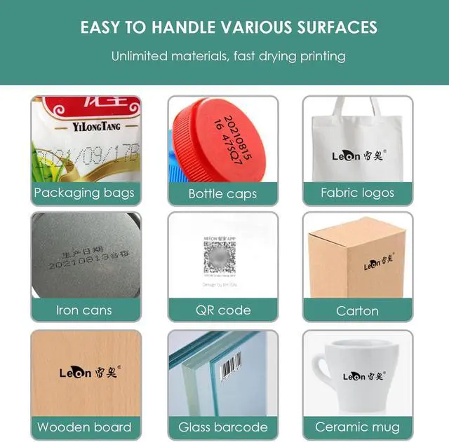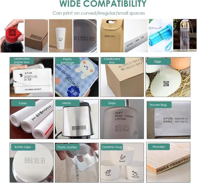 APPLICABLE: The mobile printer can print vector text, dot font, text, number, symbol, barcode, 2D codes, time, date, label, logo, cartoon pattern, etc., Pint on wood, metal, porcelain, cloth, paper, fabric, plastic, glass, leather, plastic bottle cover and other materials.