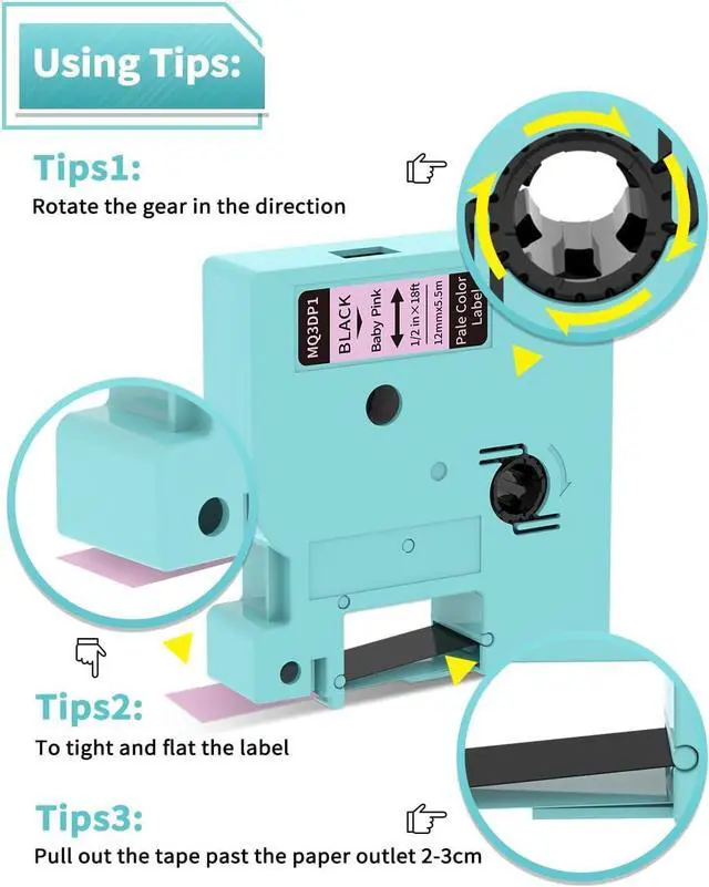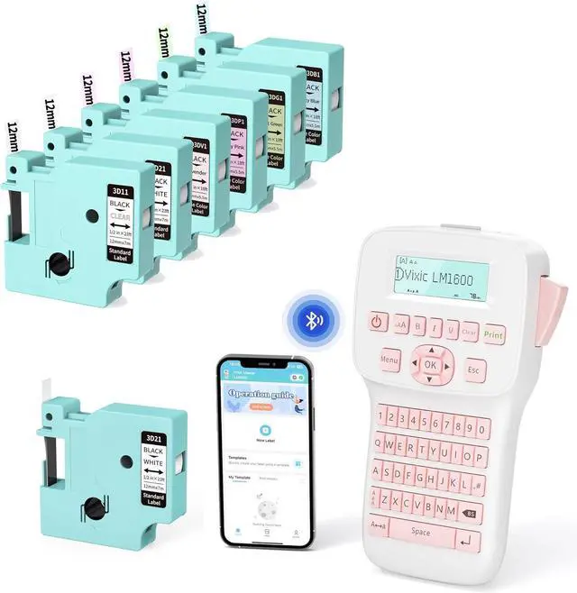 LABEL MAKER MACHINE WITH TAPE - Handheld portable label maker LM1600 with 7 label tapes: LM1600 pink label maker x 1, black print on white-3D21 x 2, 1/2 inch x 23 feet (12mm x 7m) each, 3D11 Black on Clear Tape 1/2 inch x 23 feet (12mm x 7m), MQ3DG1 Black on Mint Green Tape 1/2 inch x 18 feet (12mm x 5.5m), MQ3DP1 Black on Baby-P1nk Tape 1/2 inch x 18 feet (12mm x 5.5m), MQ3DV1 Black on Lavender Tape 1/2 inch x 18 feet (12mm x 5.5m), MQ3DB1 Black on Milky Blue Tape 1/2 inch x 18 feet (12mm x 5.5